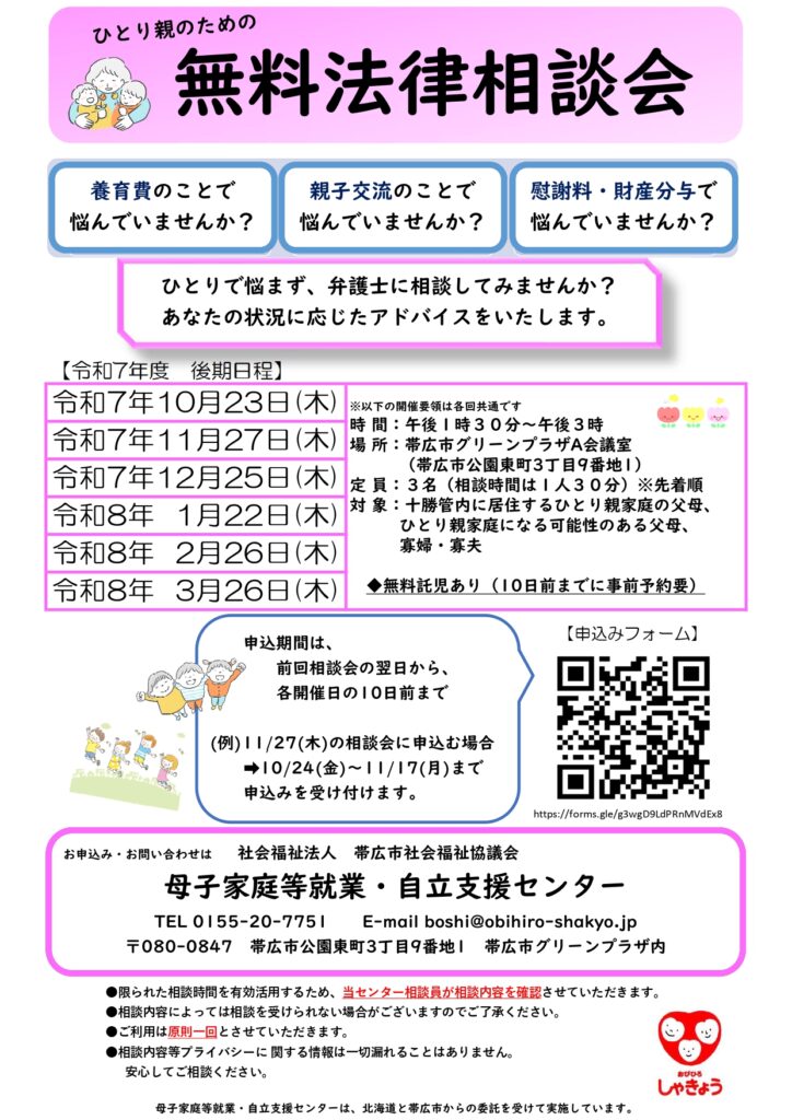 | 問合せ先 | 社会福祉法人 帯広市社会福祉協議会 母子家庭等就業・自立支援センター 〒080-0847 帯広市公園東町3丁目9番地1 帯広市グリーンプラザ内 TEL 0155-20-7751 FAX 0155-20-7752 E-mail boshi★obihiro-shakyo.jp (★をアットマーク「@」にかえて下さい) |