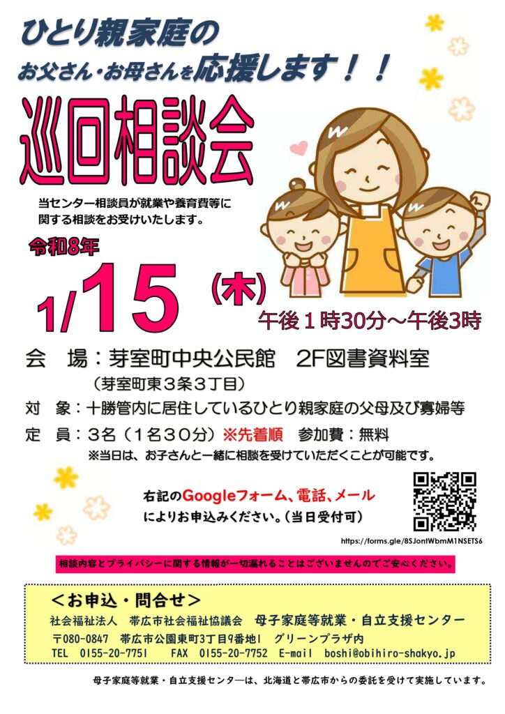 | 問合せ先 | 社会福祉法人 帯広市社会福祉協議会 母子家庭等就業・自立支援センター 〒080-0847 帯広市公園東町3丁目9番地1 帯広市グリーンプラザ内 TEL 0155-20-7751 FAX 0155-20-7752 E-mail boshi★obihiro-shakyo.jp (★をアットマーク「@」にかえて下さい) |