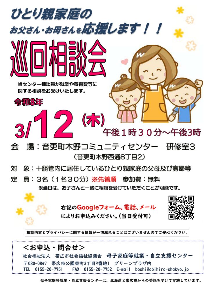 参加対象 十勝管内に居住しているひとり親家庭の父母及び寡婦・寡夫、ひとり親になる可能性のある父母
