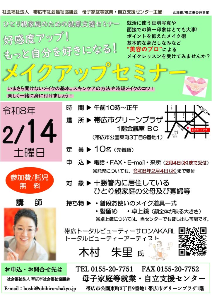 | 問合せ先 | 社会福祉法人 帯広市社会福祉協議会 母子家庭等就業・自立支援センター 〒080-0847 帯広市公園東町3丁目9番地1 帯広市グリーンプラザ内 TEL 0155-20-7751 FAX 0155-20-7752 E-mail boshi★obihiro-shakyo.jp (★をアットマーク「@」にかえて下さい) |